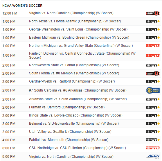 Screenshot: NCAA Women’s Soccer Schedule for Sunday, November 10th on ESPN Networks and Digital Services