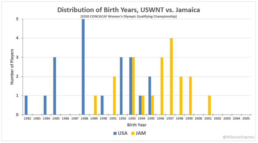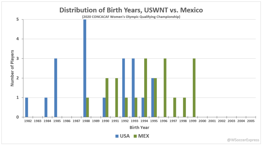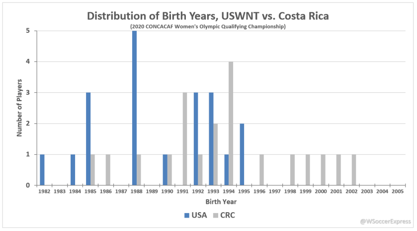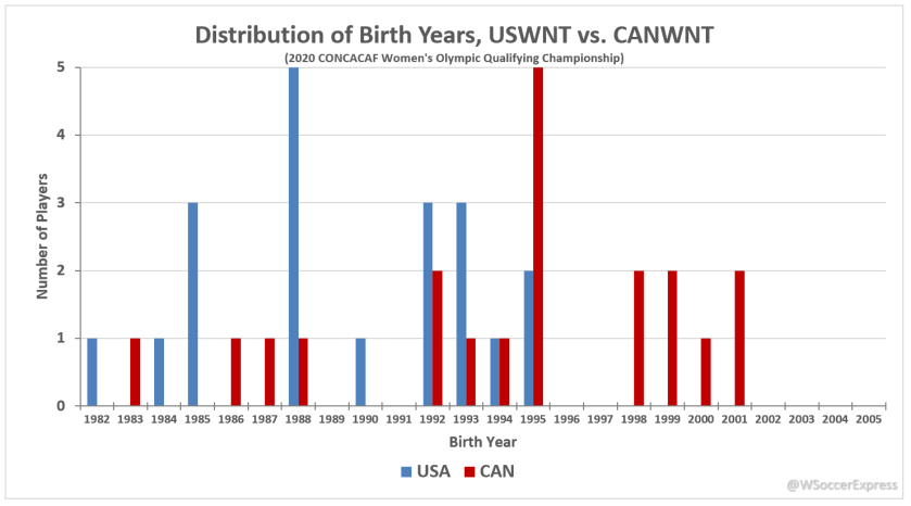 As seen on Twitter, here’s a quick post with charts showing the birth year distribution for each team’s rosters at this year’s CONCACAF Women’s Olympic Qualifying Championship.