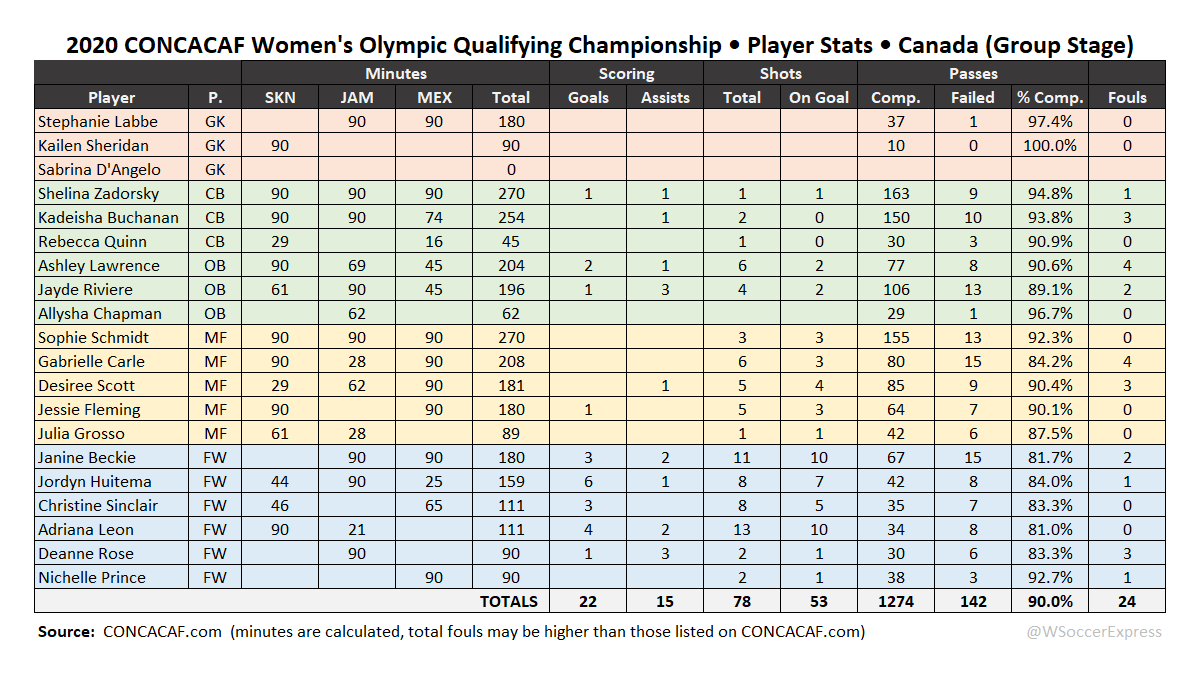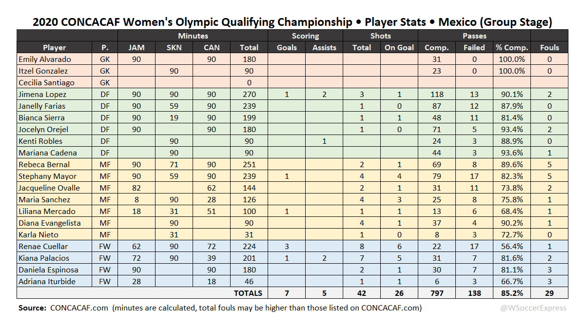 Ahead of tonight’s semifinals, which will decide CONCACAF’s two representatives for this Summer Olympic’s women’s soccer tournament, here are summary tournament stats for the four semifinalist squads.