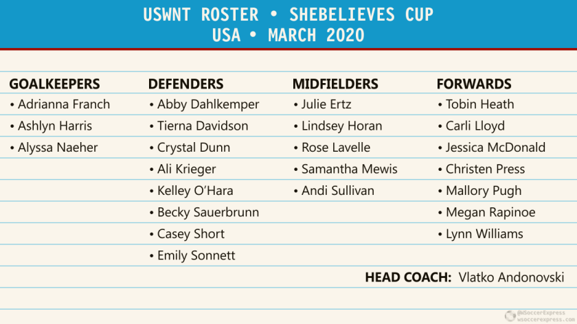 The USA’s SBC roster consists of all 20 players from Olympic qualifying, plus defender Tierna Davidson, forward Mallory Pugh, and outside back Casey Short. From the pre-tournament training camp roster, goalkeeper Jane Campbell, outside back candidate Margaret Purce, and midfielder Jordan DiBiasi were cut.