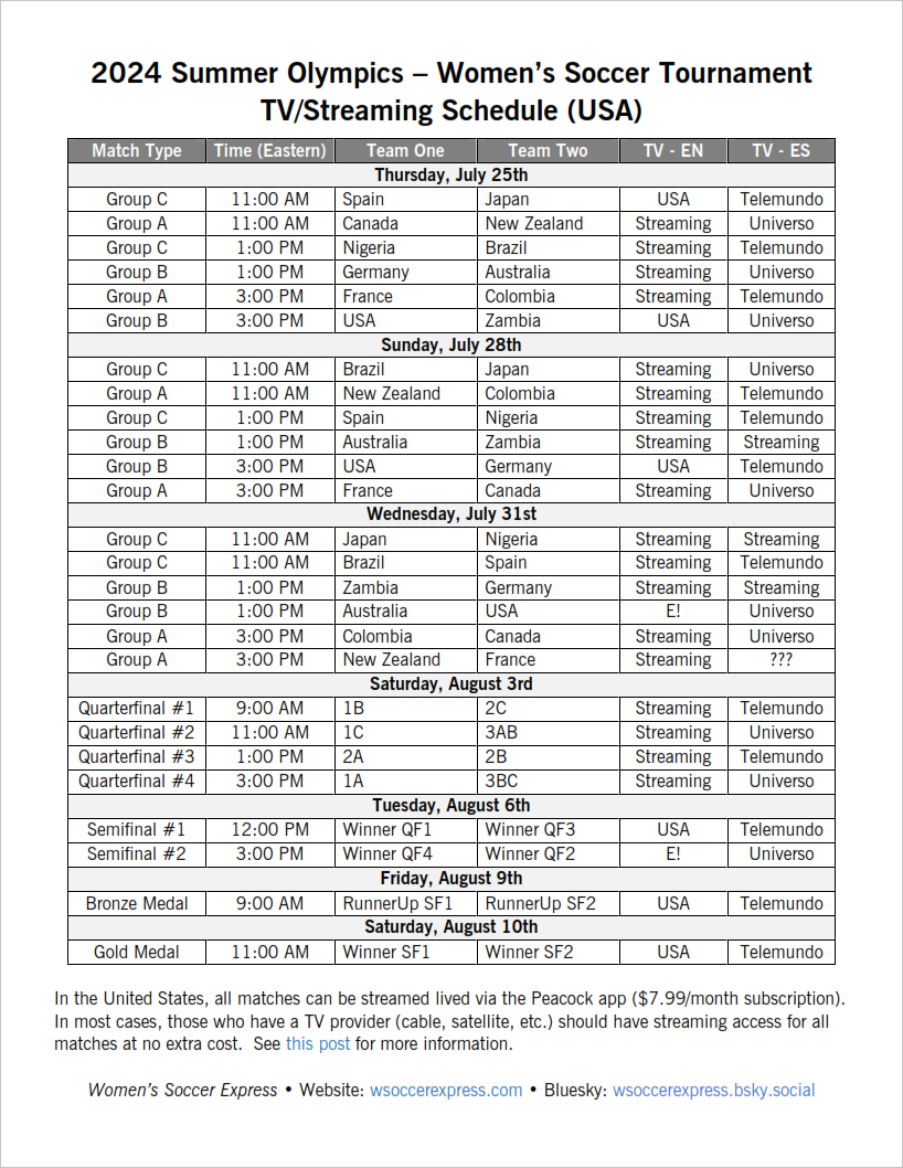 Here is a no-frills one-page schedule that lists the times and TV details for all 26 matches of the women’s soccer tournament at the 2024 Summer Olympics.