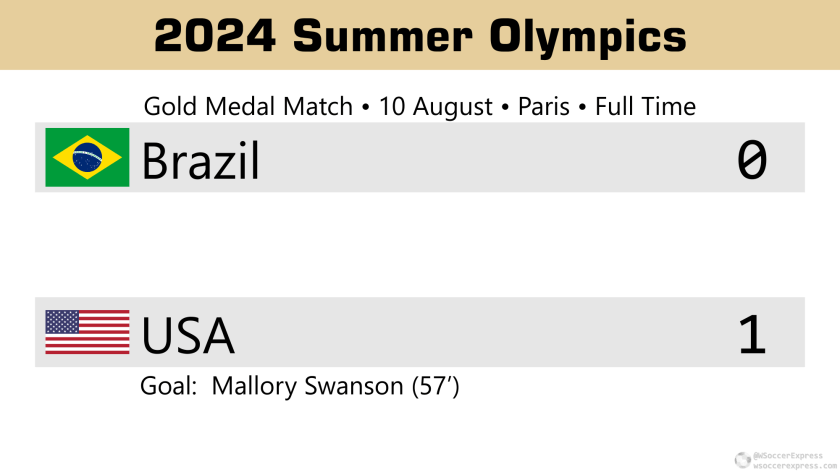 “Three times is a pattern”, as the (not entirely on point) saying goes. For the third time, the United States Women’s National Team faced Brazil in the gold medal match at the Summer Olympics (2004, 2008, and 2024). And, for the third time, the USA claimed gold, while Brazil and Marta had to settle for silver, with Germany securing a bronze medal as consolation. Also, for the third time in as many matches, The USWNT won by the slimmest of margins, 1-nil, on a goal scored by one of the starting front three. Additionally, this is the third time since the introduction of the women’s soccer tournament (1996) that the Summer Olympics was hosted by a European country, and once again, the USA won gold on European soil (2004 in Greece, 2012 in the United Kingdom, and 2024 in France).
