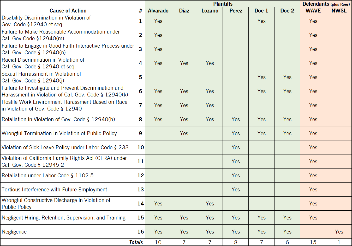 As mentioned earlier, the San Diego Wave organization is the named defendant for the first fifteen causes of action, while the NWSL is only a named defendant for the negligence claim.