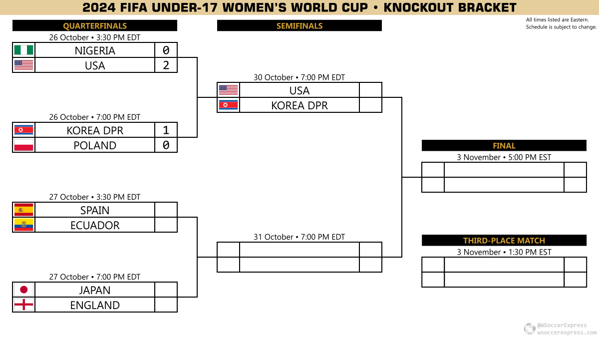 For the first time since the inaugural FIFA Under-17 Women’s World Cup in 2008, the USA are back in the semifinals thanks to their 2-nil victory over Nigeria. The USA’s opponent will be Korea DPR who were held to only a lone goal by Poland in Saturday’s other quarterfinal.