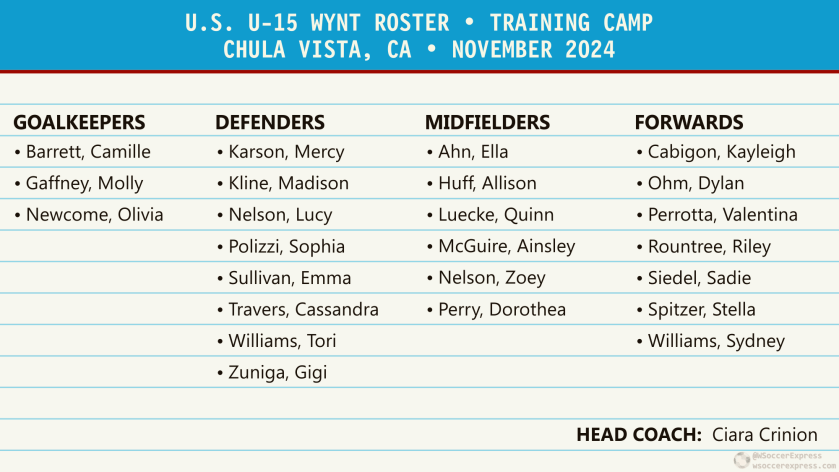 U.S. Soccer Press Release: “U.S. Under-16 and U-15 Women’s Youth National Teams Will Hold Concurrent Training Camps in Chula Vista, Calif.” (12-Nov-2024)
