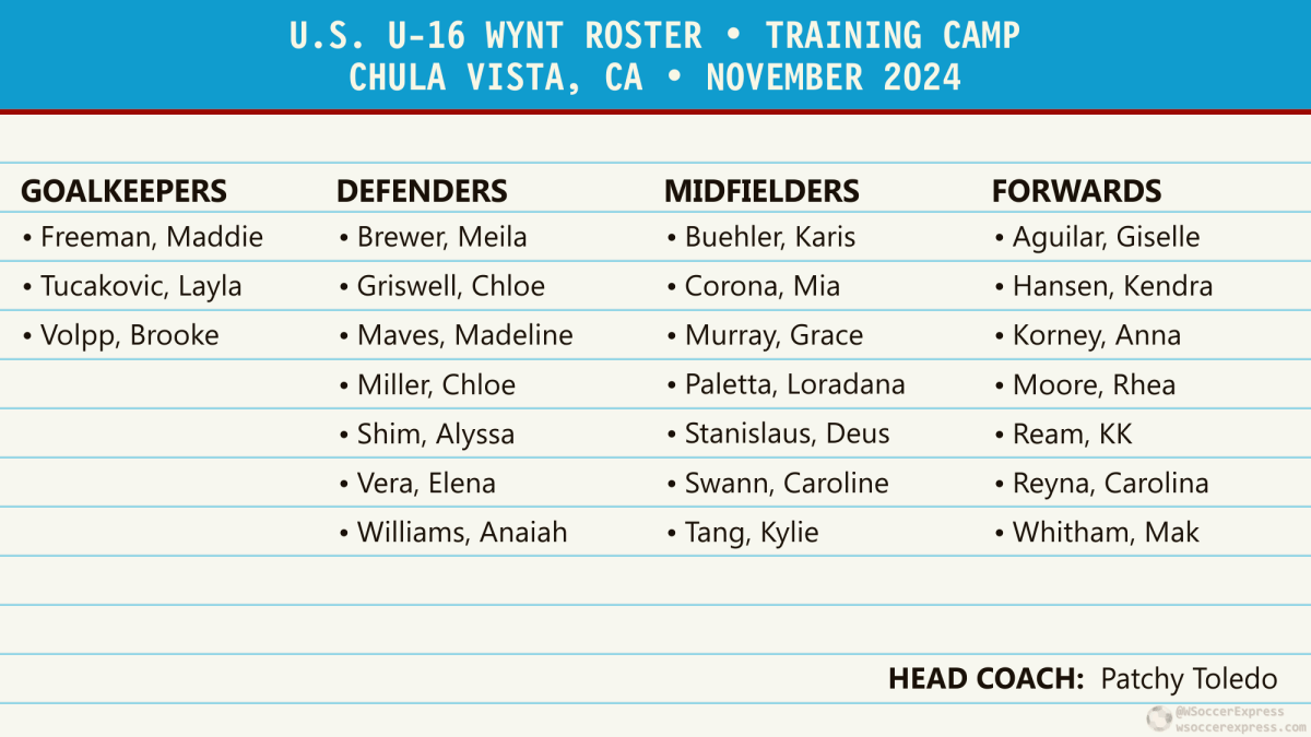 U.S. Soccer Press Release: “U.S. Under-16 and U-15 Women’s Youth National Teams Will Hold Concurrent Training Camps in Chula Vista, Calif.” (12-Nov-2024)