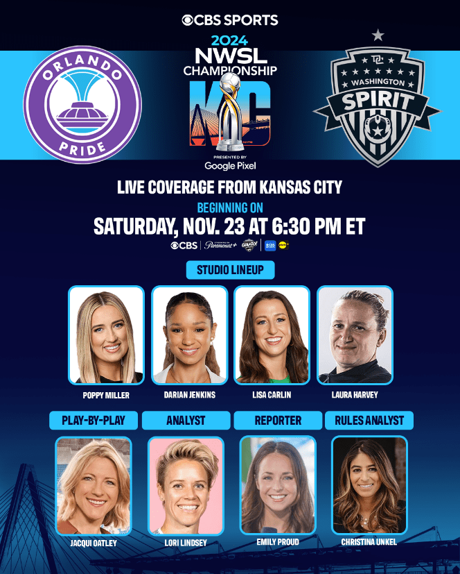 For additional broadcast details, see this CBS Sports press release: “CBS heads to Kansas City’s CPKC Stadium to present multiplatform coverage of 2024 NWSL Championship…”.