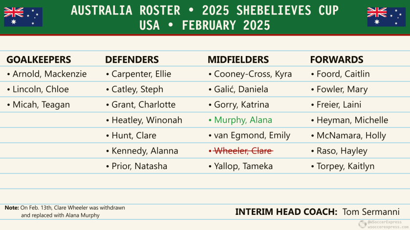 Update: (17-Feb-2025): Midfielder Clare Wheeler has been withdrawn due to a thigh injury. The uncapped Alana Murphy of the Melbourne Victory has been called in as a replacement. (matildas.com.au) Also, the Australia WNT has published the players’ shirt numbers for this tournament (Instagram).