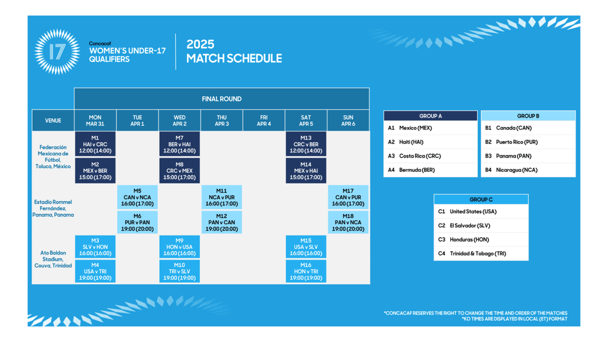 Schedule Source: 2025 Concacaf Women’s Under-17 Qualifiers Final Round Match Schedule (PDF)