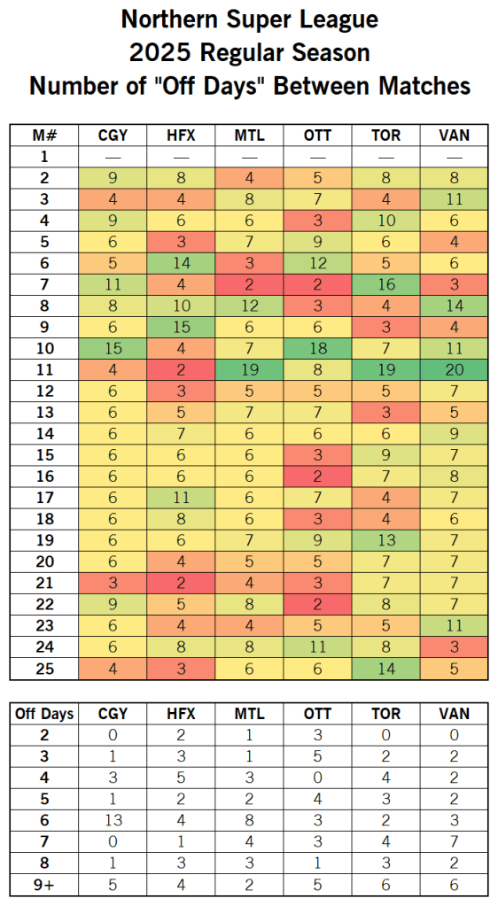 Vancouver also has a relatively uncompressed schedule, with a stretch of 14 matches where all but one has six or more off days before each match.
