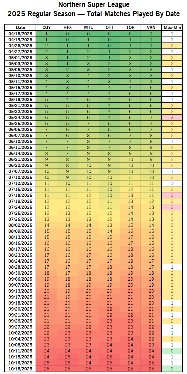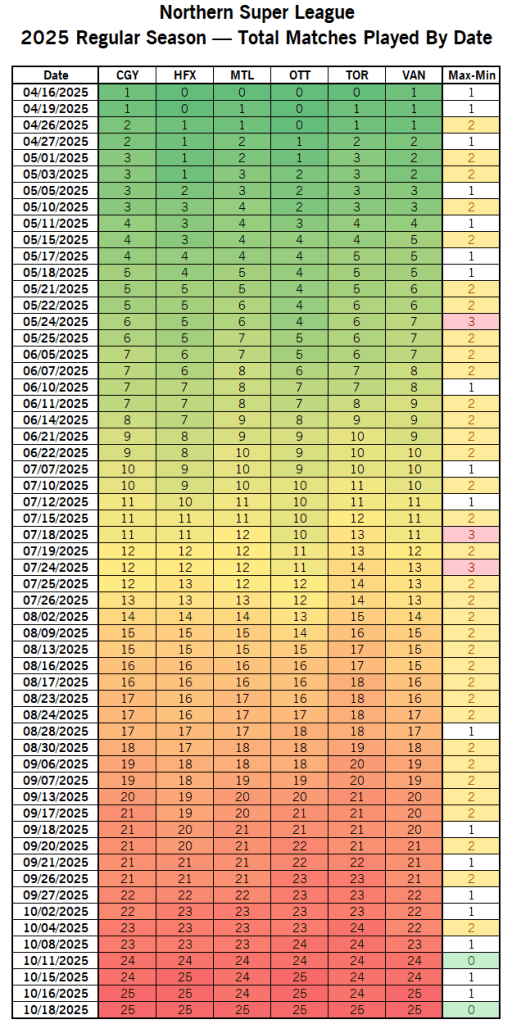 For most of the 2025 regular season, the cumulative number of matches played by each club will be significantly unbalanced, with one team having two matches in hand compared to one or more of the other five teams. Except for the final day, all six teams will be on the same number of matches played just once (October 11).