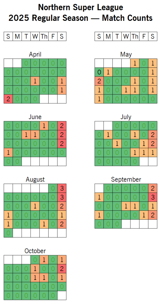 During the 2025 regular season, just 54 of the 75 matches will be played during a weekend (Friday to Sunday). Nine matches will be played on either a Tuesday or Wednesday, while 11 matches will be contested on Thursdays.