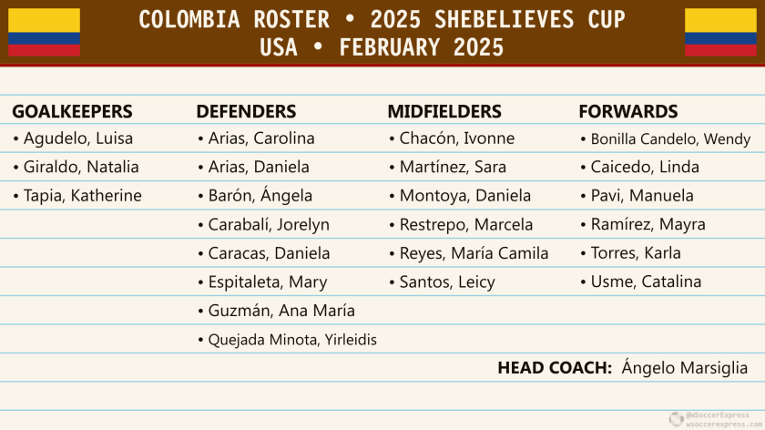 Another key absence is midfielder Ilana Izquierdo, whose senior season at Mississippi State (player profile) was cut short in October 2024 due to an apparent ankle injury (news article, Instagram). Izquierdo started two of Colombia’s four matches at the Paris 2024 Olympics and started all four of their matches at last year’s Concacaf W Gold Cup.